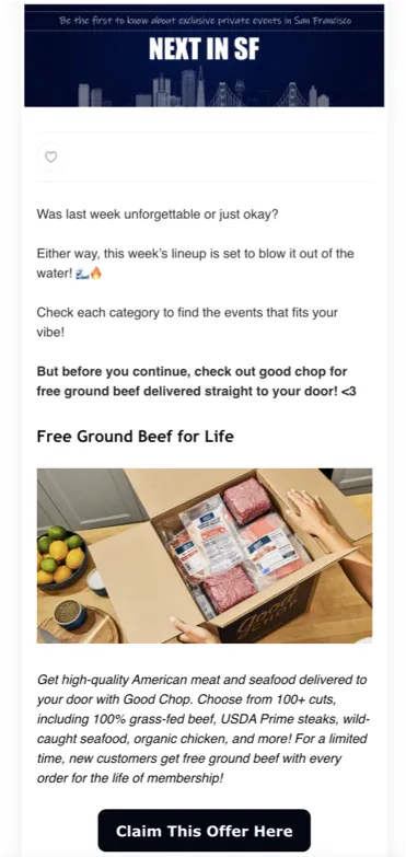 Next in SF is a curated local newsletter focusing on San Francisco's best events, experiences and opportunities. Unlike generic city guides, we handpick only the most relevant content for our affluent, tech-savvy audience. With our 50%+ open rates and 4%+ CTRs, we've become a trusted source of information for over 10,000 engaged San Francisco residents who look forward to our recommendations each week.